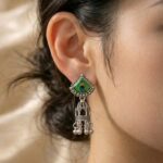 Celebrate timeless Indian artistry with these stunning oxidized silver peacock motif jhumka earrings. Featuring a beautifully detailed peacock feather design with rich green enamel accents, these earrings reflect traditional temple jewelry aesthetics.